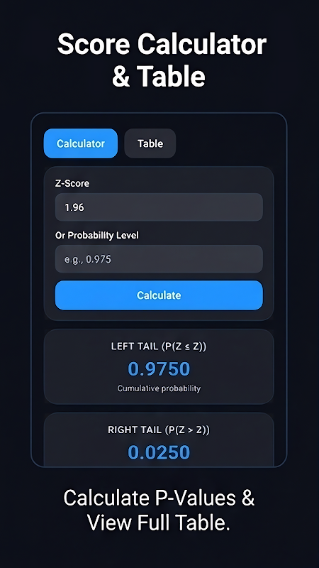Bu uygulama, hipotez testlerini, güven aralıklarını, ANOVA'yı, olasılık ve araştırma problemlerini daha hızlı çözmenize yardımcı olur. Tüm tablolar sınava hazır, okunması kolay ve tamamen çevrimdışı çalışır.