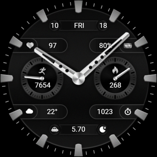 Kadran, Wear OS 1'de çalışmayı destekliyor. Dış çember: Özel UYGULAMA (şeffaf) 2. Üst: Tarih, Hafta, Kalp Atış Hızı, Pil Seviyesi 3. Orta bölüm: Adım sayısı, adım hedefi yüzde göstergesi, kalori ve yüzde göstergesi 4. Alt: Özel veri, mesafe, özel UYGULAMA Özelleştirme: Seçim için birden fazla özelleştirme alanı mevcuttur Uyumlu cihazlar: Pixel Watch, Galaxy Watch 4/5/6/7 ve üzeri ve diğer cihazlar