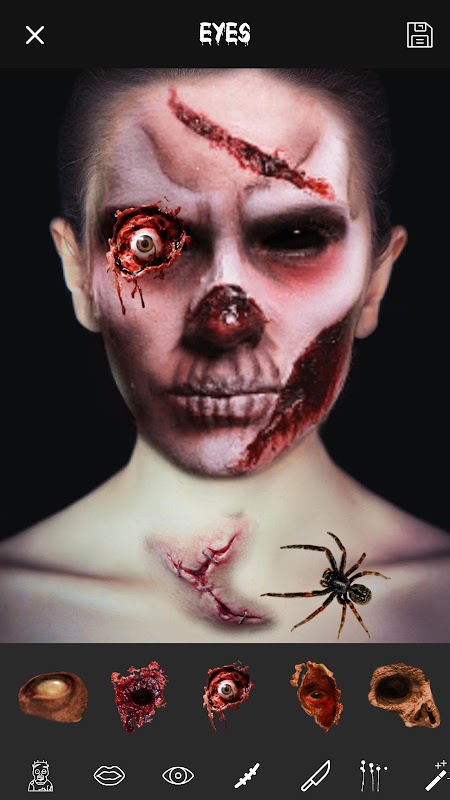 ✓ Farklı Zombie Face FX eklemek için: burun, kulak, alın, yara, kan, yara, kafa, bıçak, ağız, yüz…