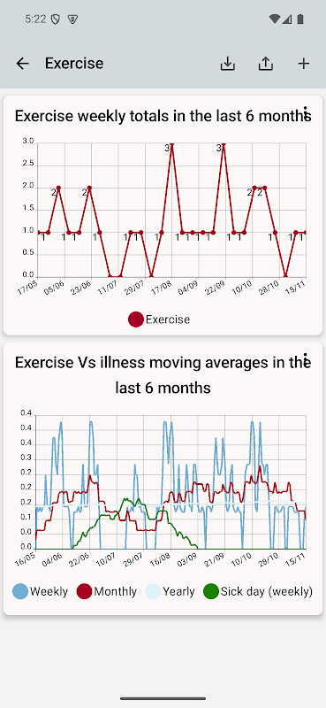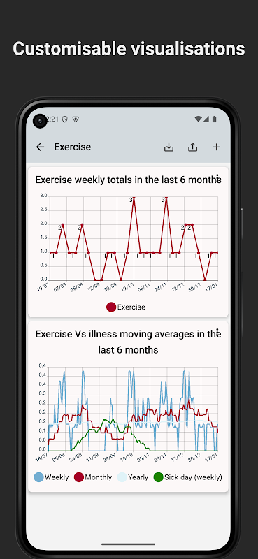 Track & Graph is completely free and open source with no ads, accounts, or in-app purchases. Your data remains private—stored only on your device—and can be easily backed up at any time.