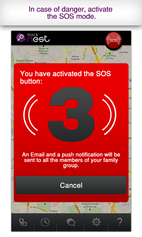 - Take action with the SOS button in case of extreme emergency. If a family member clicks on this button, you will receive an instant notification, a SMS and an email, with the exact GPS position of this user. If the device allows it, you'll also receive a link to access 10 seconds of video recorded from the device that has generated the SOS alert.