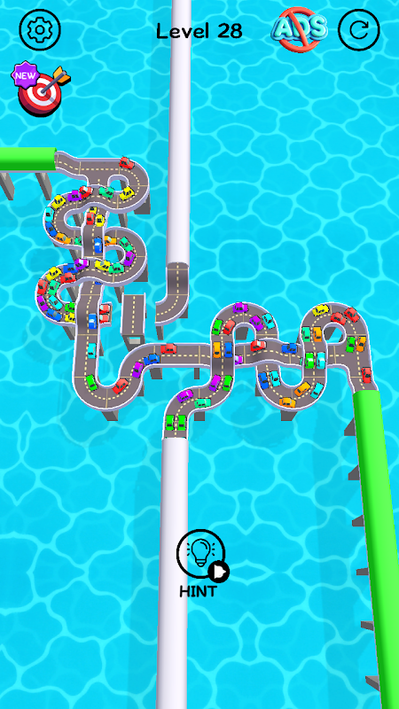 Clean visuals with roads, cars, bridges, and water