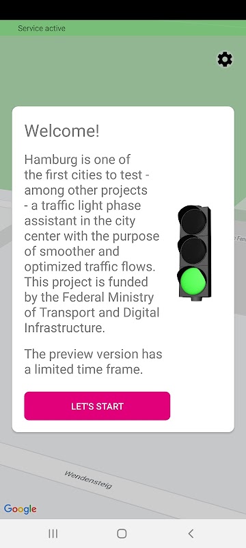 The Traffic Light Assistant is a location and map-based service. The service determines the traffic light systems relevant to the user based on the position of the user and his driving direction and provides signal phase information and a forecast of the next change of phase of the traffic light. The service can be configured as driving a car, e-scooter, bicycle, or truck, to indicate the driver the appropriate speed level. By providing the traffic light data in advance the app will support a more relaxed driving behavior and can positively influence the traffic flow. Furthermore, an additional collision warning function is integrated. It calculates possible future collisions of road users based on the position and trajectories of several users in a so-called accident hotspot (e.g. at an intersection). Road users are warned in good time before the collision with other road users will happen or notified of unavoidable collisions with an emergency warning.