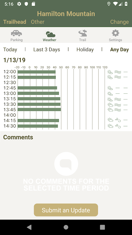 Contributing to TrailCheck's database is easy. Click to submit a parking, weather or trail update and optionally select a location on the trail. Move a few sliders to show the conditions, and add comments if you want to share more details. You can enter updates from the trail, back at the trailhead or from home later. Every submission makes the app work better!
