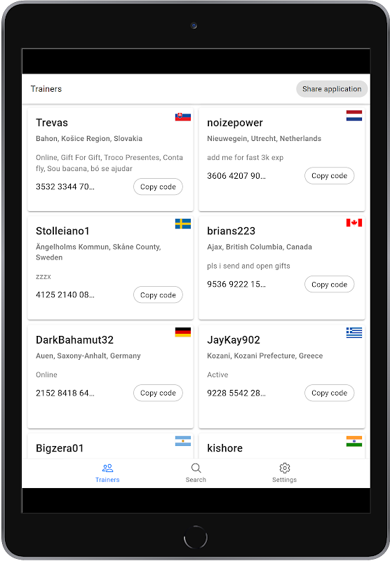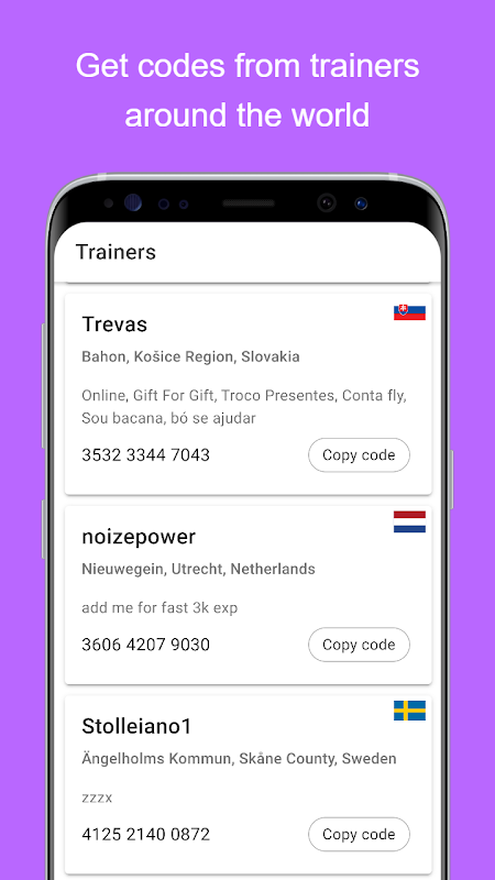 Trainer codes is an app aimed at trainers who share codes and in-game resources. Meet trainers from different countries, share resources and evolve in the game.
