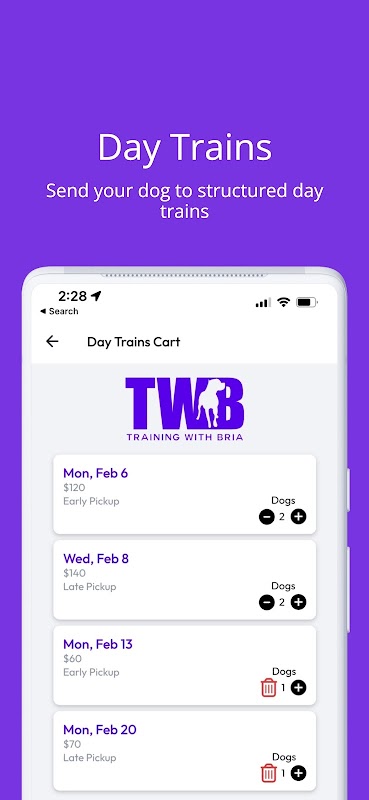 Use the TWB Pack scheduling app to schedule classes and day trains with ease!