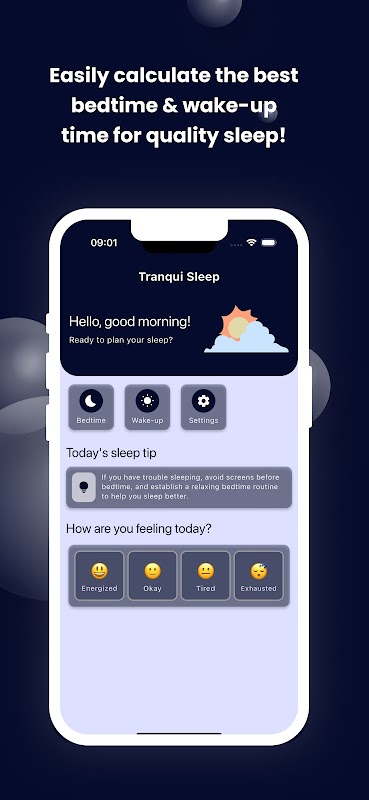 Do you struggle with waking up tired or feeling groggy in the morning? With Tranqui Sleep, you can easily calculate the best bedtime and wake-up time based on your sleep cycles, ensuring you wake up refreshed and energized!