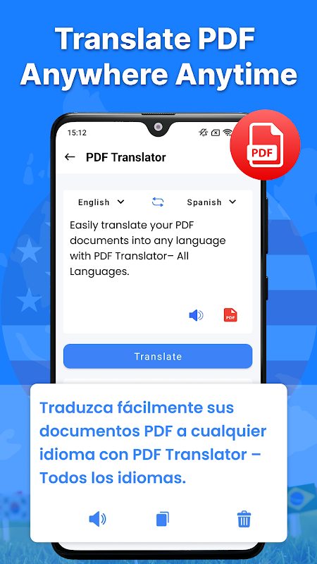 The Talk & Translate languages app provides the feature of a PDF translator. You can import your PDF files from documents and translate them with the language translator app.