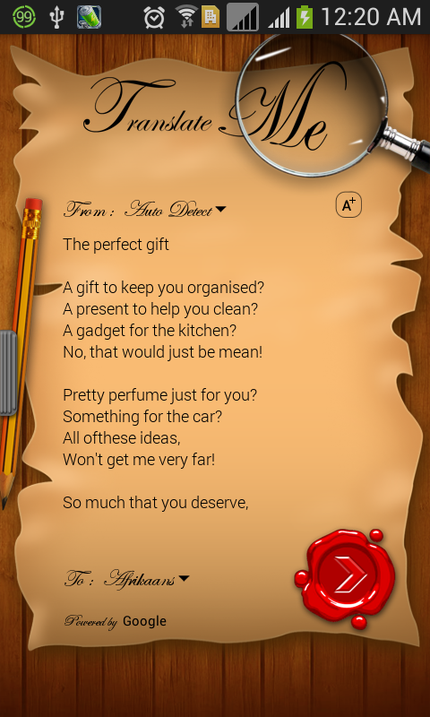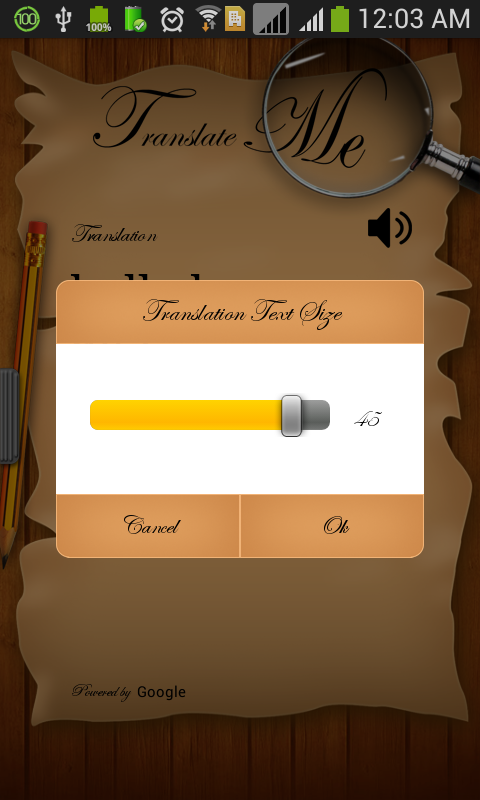 An application using Google translation service to translate more than 60 pair of languages. Translate Me can translate unlimited text. The source of translation may be a text file or SMS.