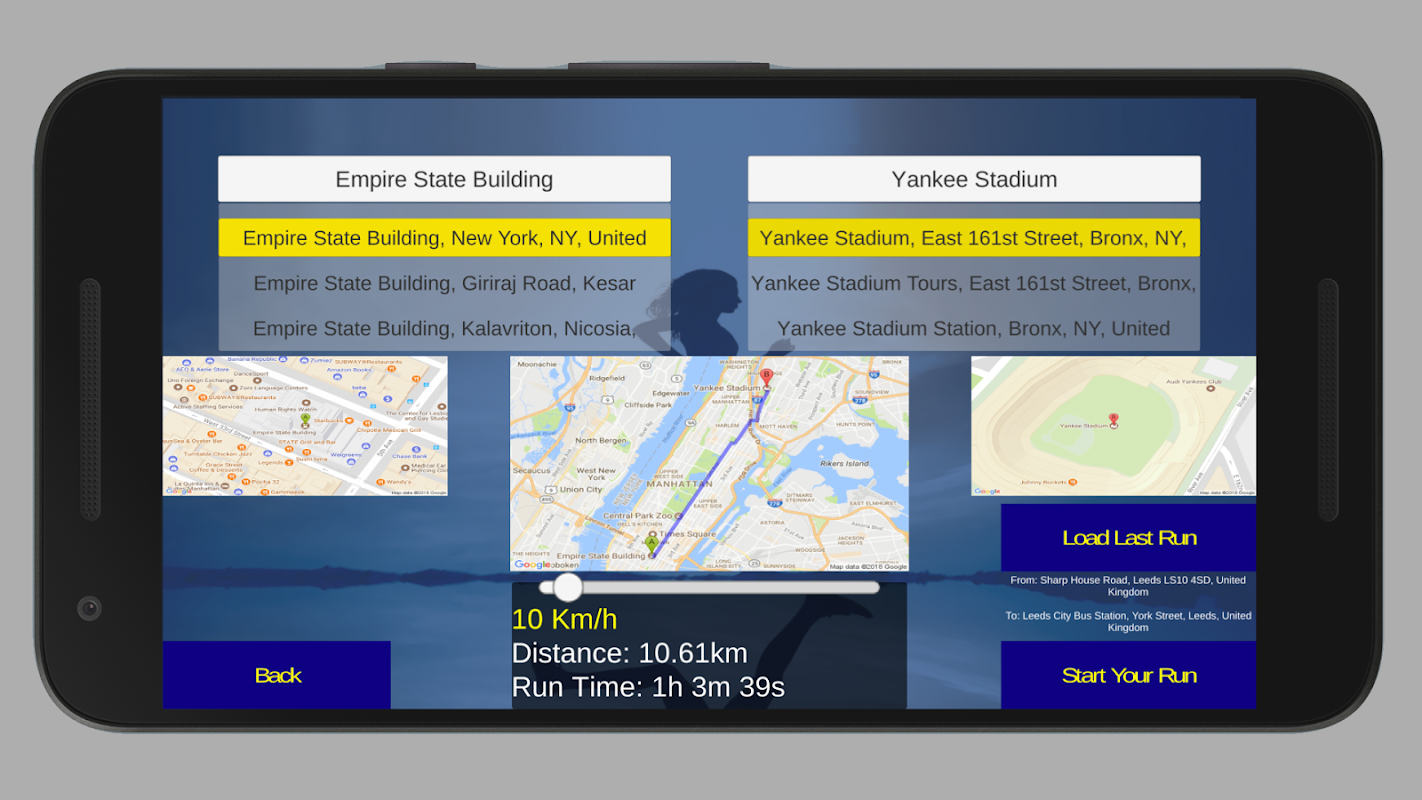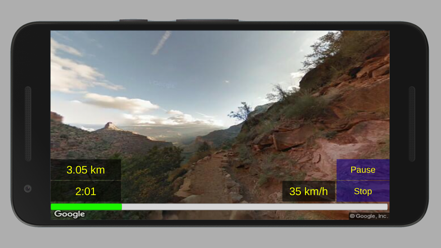Google Street View images will take you on your run at the speed you've set. Imagine a presentation where your route is a series of image slides, BUT only appear when you'd have arrived there in real time.