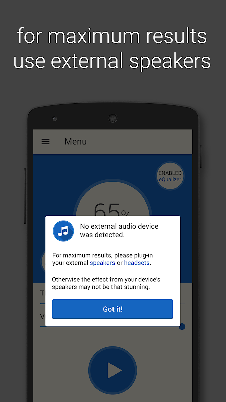 Treble Booster is a native app which will allow you adjust your treble level. For maximum results please plug-in external speakers or headsets.