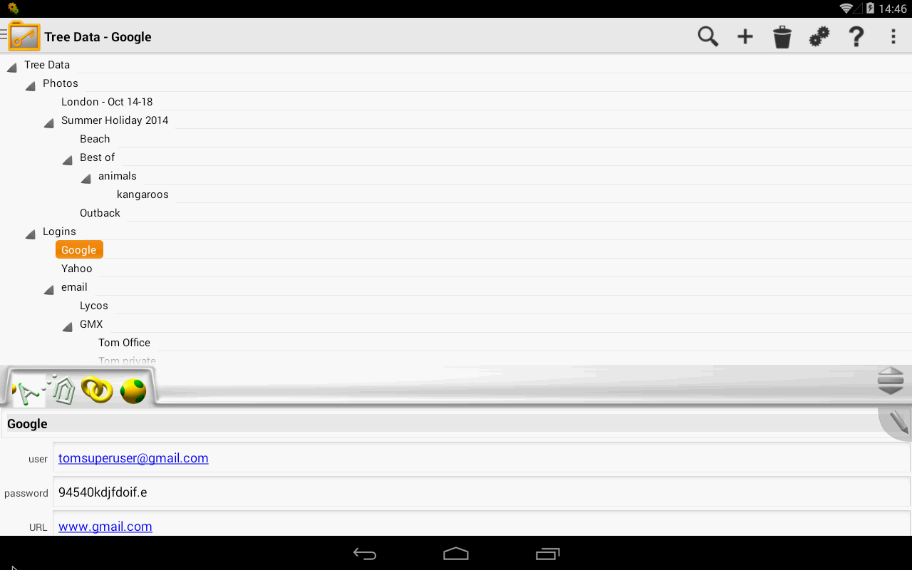 1. Encryption: All data is encrypted with Advanced Encryption Standard AES-256. Even if somebody is stealing or copying your device or SD Card they’ll be unable to read the data saved in Tree Data.