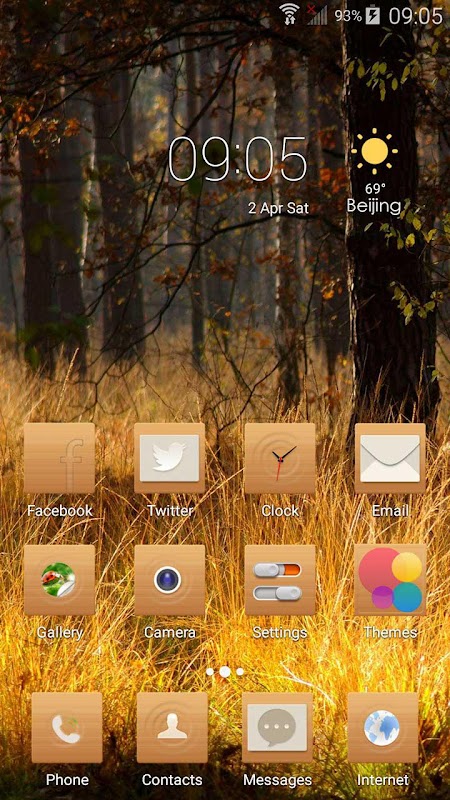 The Tree theme contains tall trees and golden lush grass, with icons the dark yellow color, does this make you remember the good old days? come and download Tree theme and enjoy your journey to the cherished memory.