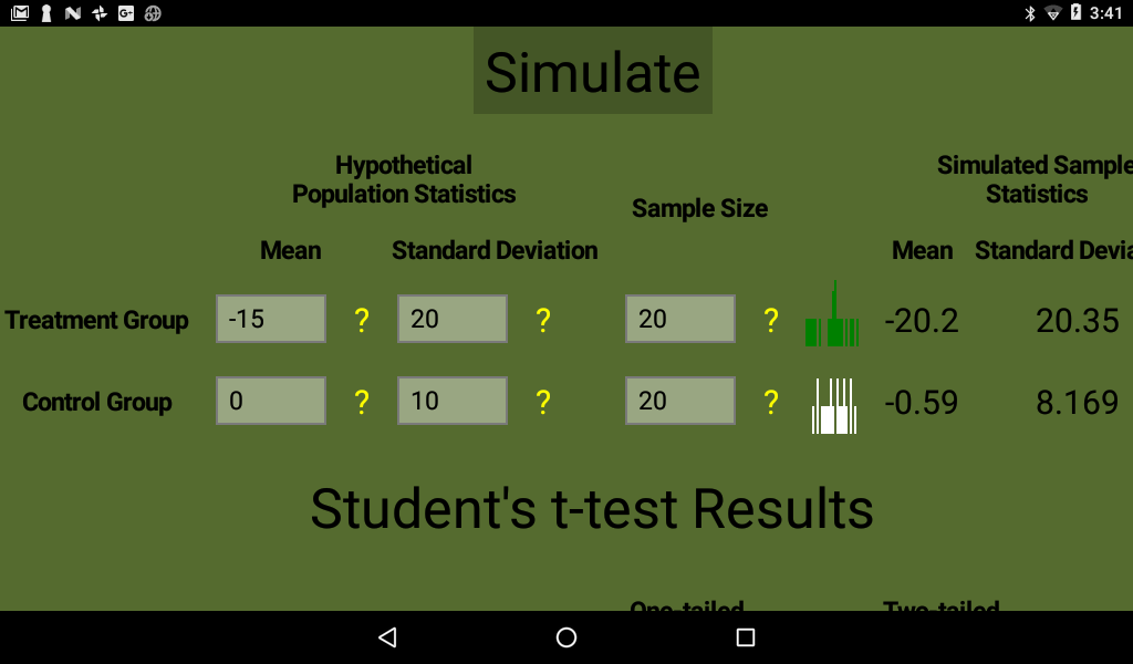 The simulator can help provide some sense about the outcome of a study under different scenarios (e.g. different standard deviations, sampling sizes). It can supplement power analysis. For example, suppose a study on a cholesterol lowering drug is about to be conducted and one measure of the outcome is the cholesterol level change in one month. In addition, it is hypothetically assumed that the mean and the standard deviation are -15 mg/dL and 20 mg/dL respectively for the medication arm. The corresponding parameters for the control arm are 0 mg/dL and 10 mg/dL. Different sample sizes can be entered to see how they affect the statistical significance of the difference between the treatment arm and the control arm. The standard deviations and the means can also be altered to see their effects. The same set of parameters can be run multiple times to see how the effect of the inherent random nature.