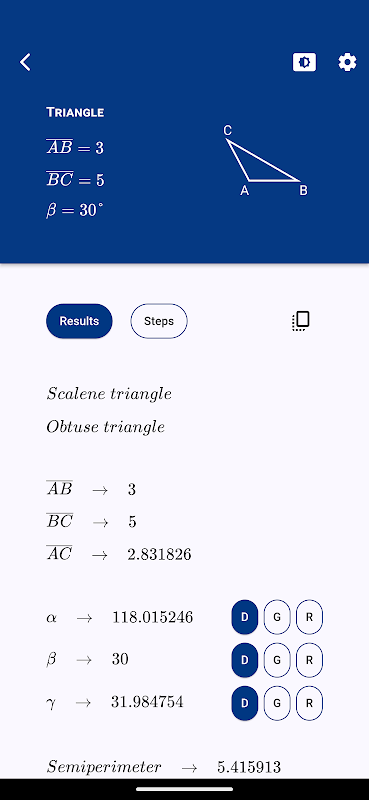 • Triangle calculation: Enter three values and get all the triangle details: angles (in Deg, Grad, Rad), sides, perimeter, area, heights, and more. You can also view the steps for better learning.