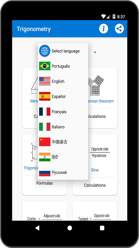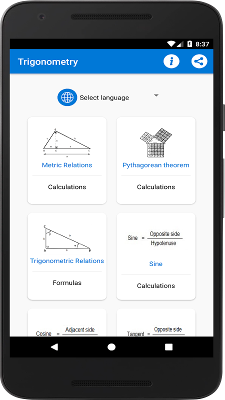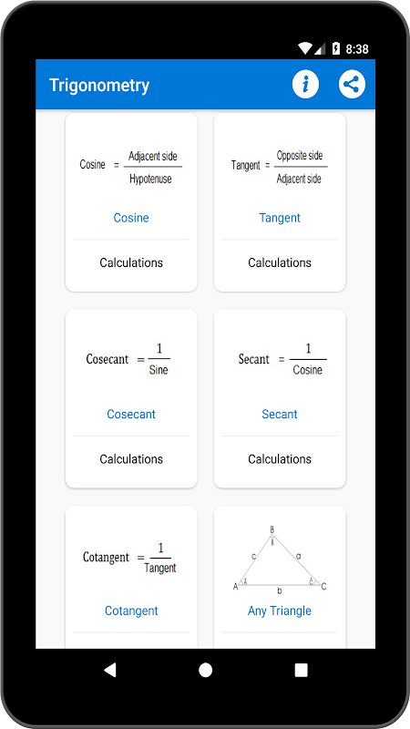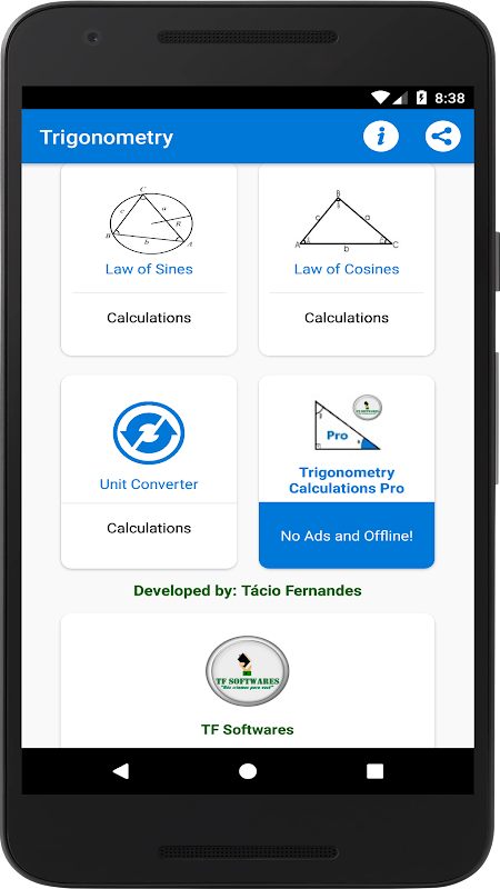 The TF Softwares Trigonometry Calculations application was developed to support students, in order to facilitate and assist the understanding of the basic calculations that are necessary to find the values of the sides and angles of triangles.