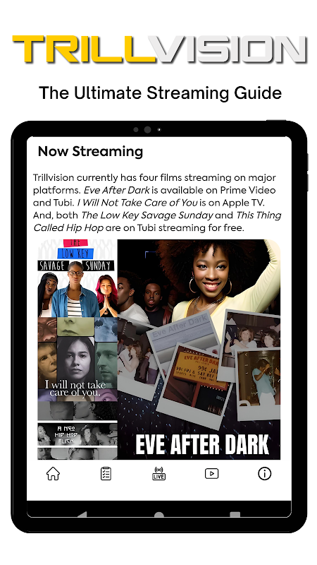 With a focus on urban contemporary media, emotional wellness and inclusive storytelling, the TRILLVISION brand has produced award winning content that challenges conventional filmmaking, while embracing new artists and new experiences. From major streaming services and film festivals to live-stream events and podcasts, our inspirational content is free and on-demand. In addition to our original entertainment, the TRILLVISION app also curates film and television streaming guides to assist users with finding quality content on all major streaming platforms. Download the app and discover who and what is next in the world of diverse and expansive digital content.