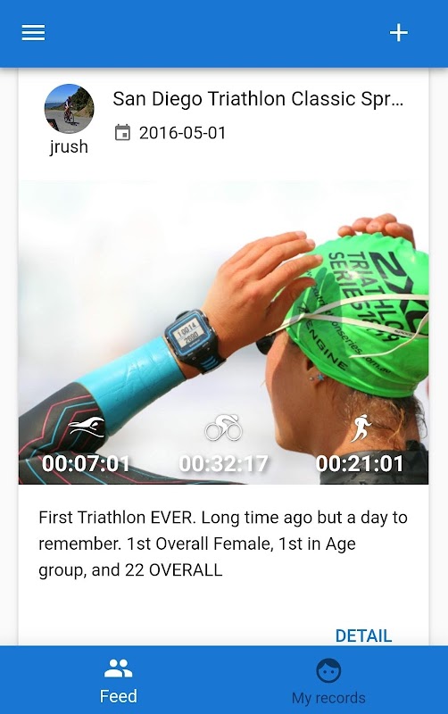 In addition to the usual swim/bike/run breakdown, it can also easily record transition times(T1/T2) and category ranking.