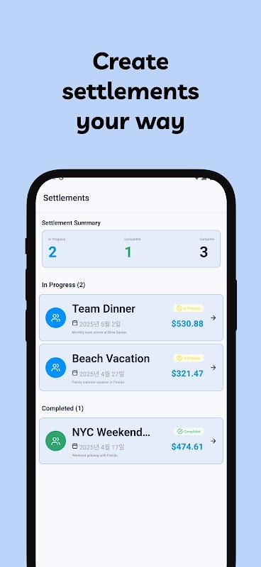 - Easy Sharing: Share settlement results via message or email with just a few taps.