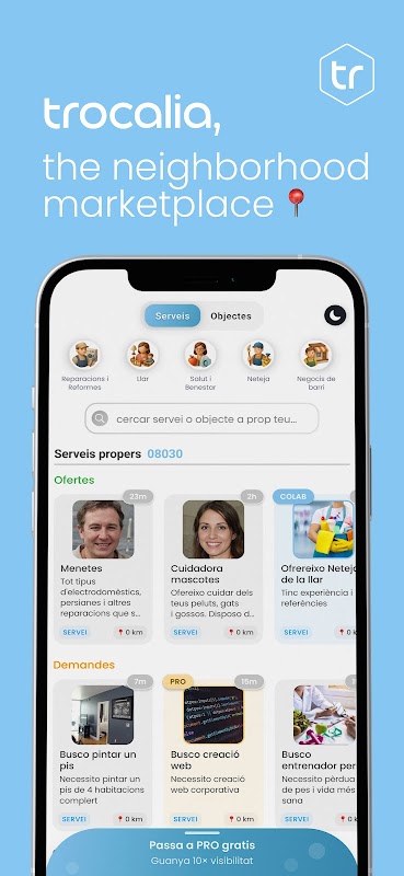 We are the community where neighbors offer, seek, and exchange services and objects. Find what you need and share your skills in your area. It is a platform designed to answer a key question: how can we facilitate mutual aid and exchange within our local community? The answer is simple and effective: by connecting those who offer services and objects with those who need them.