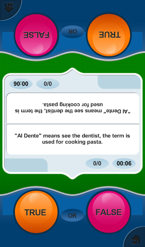 How savvy are you when it comes to determining fact versus fiction? Do you have a natural bull!$%& meter? If so, True or False is the game for you! Your challenge is to quickly decide if each fact you are faced with is True or False. The clock is running and time is not on your side, so the more knowledge you have about a range of topics from entertainment, to sports, to science, geography, and food the better your score will be! Of course, True or False is also the fastest, easiest way to learn new trivia! The correct answer is revealed in each round, so youll be able to garner new nuggets of knowledge on the spot!