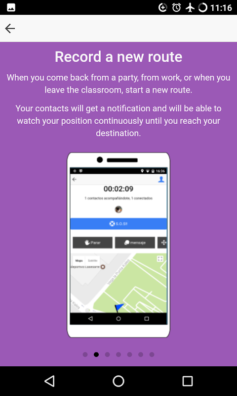 We can be accompanied by our trusted contacts whenever we want (when coming home from school/university/fiesta/party). These, will be able to know our GPS location in real time and can also receive messages in case of changing the course of our route. Only those contacts that we add will be able to see our routes.