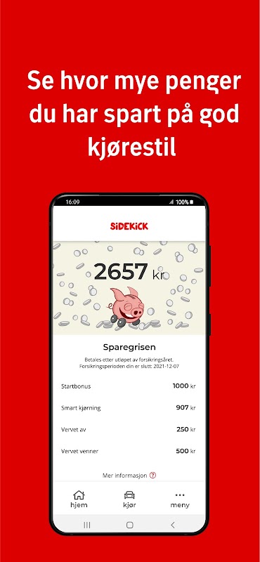 Sidekick is a unique and smart car insurance for young drivers between 18 and 30 years old. The car insurance works in a simple way: You install an OBD2 unit (that you will receive from us) in your car. The unit collects data about acceleration, how you turn and braking, among other things. The data transforms to a driving score that you can see in your Sidekick app, which is downloadable on your phone. Here you also get feedback on how to improve your driving skills. The unique thing about Sidekick is that you can save money on being a safe driver. When you are driving safely and with a good flow, we fill your piggybank in the app with money after every trip. When the insurance year is about, you will receive the money along with the money for mileage you may not have used.