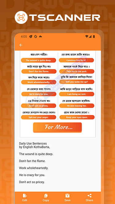 Easily extract text from both PDF documents and images with TScanner. Whether you need to digitize printed materials, extract valuable data, or convert handwritten notes into editable text, our app simplifies the process. Simply scan your documents or images using your device's camera or select from your gallery. Watch as it instantly transforms them into shareable, editable content. Say goodbye to manual typing and save precious time with this efficient and user-friendly text extraction tool. Download TScanner now and revolutionize how you handle text in PDFs and images.