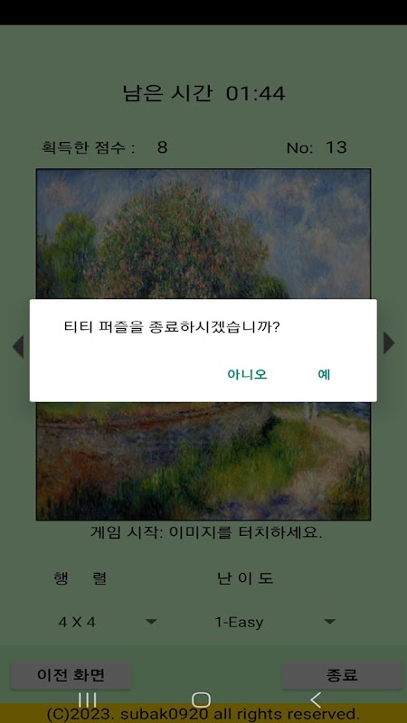 In the bottom picture, if you touch the two squares, the pictures will swap. We made it possible to do a variety of puzzles, from 2-row, 2-column puzzles to 15-row, 15-column puzzles.