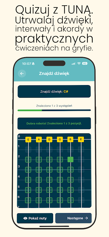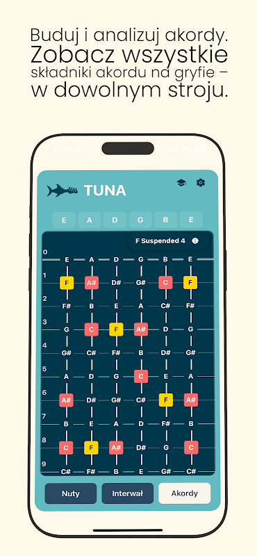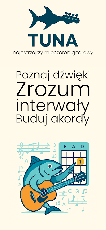 Poznaj gryf jak nigdy dotąd: ucz się dźwięków, interwałów i akordów na gitarze lub basie.