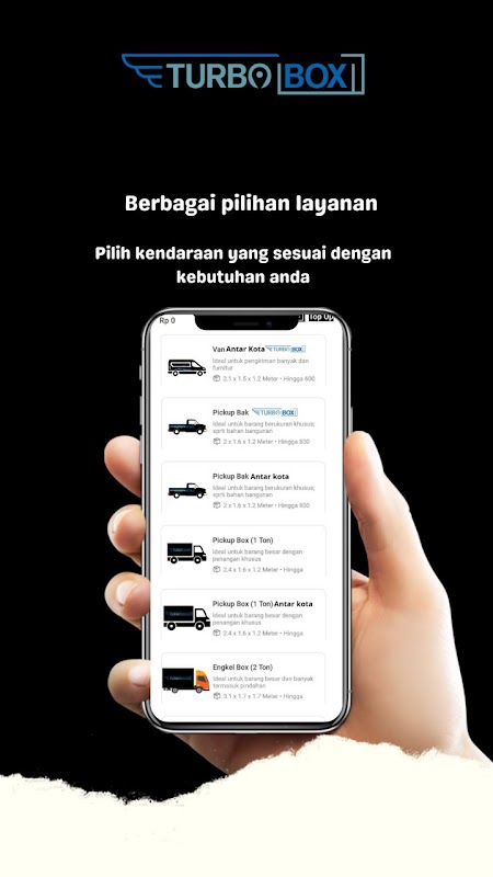 The transportation listed on the Turbo Box application is all suitable for use, the drivers are very skilled and experienced, have an active STNK and KIR, so you don't need to worry when your goods are carried by our drivers or couriers.