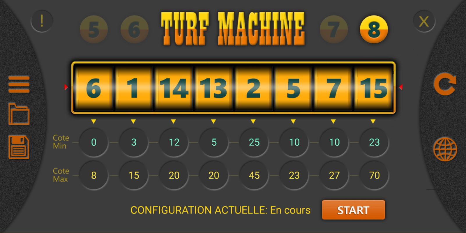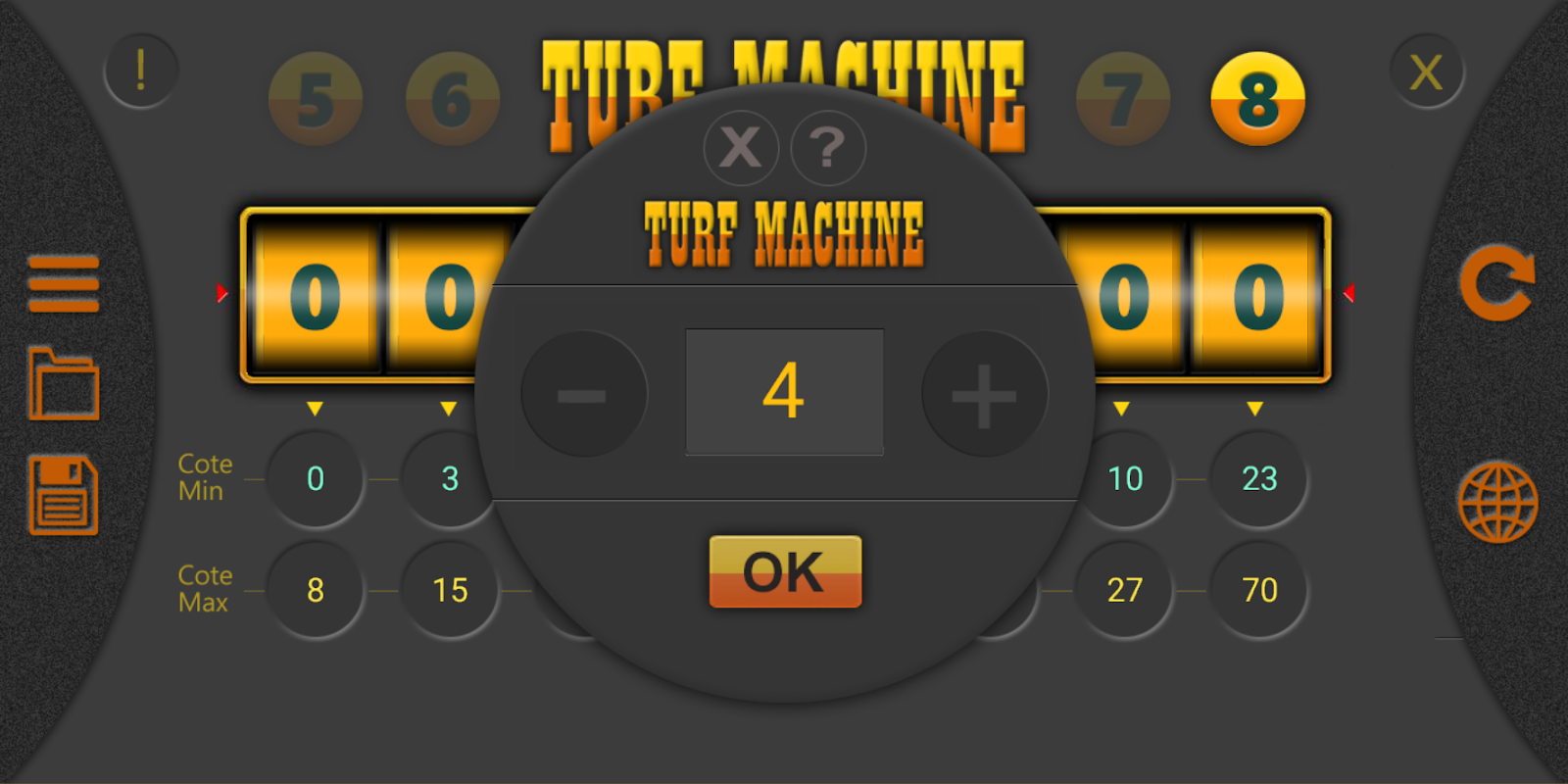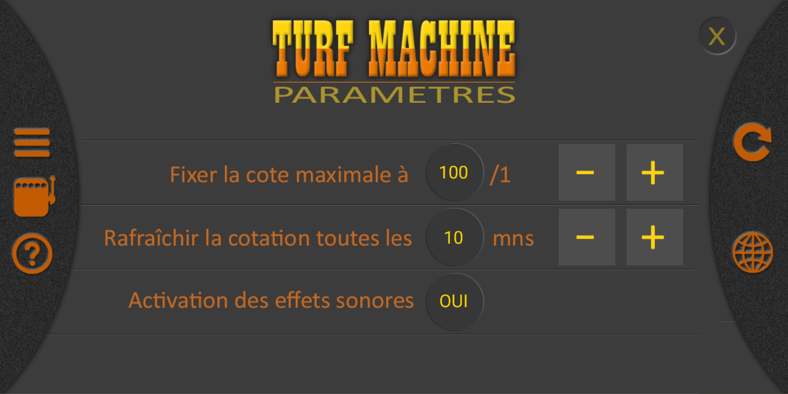 TURF MACHINE is a free application that allows you to create, in a fun way of a slot machine, a unique and original prognosis for the Quinté + race of the day, and this from the REAL COTES of the horses in the running (refreshed all 10 minutes). She is in a way a game aid.