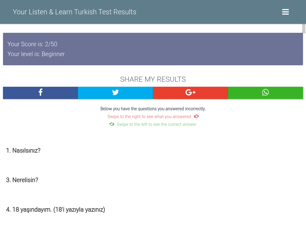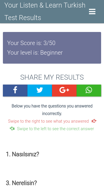 Take our Turkish Level Test, a 50 question test with instant results and explanation of your level, completely free. Don't be shy, challenge yourself and find our your level now, it only takes 10 minutes.