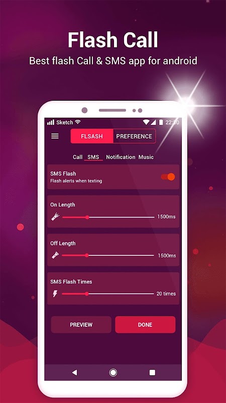 ✔ Set flashlight alerts ON for SMS message or call flash.