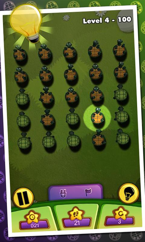 Designed for children and adults alike, Turtles will challenge and stimulate your brain on a daily basis. The goal of the game, turning over all the turtles in the same position is easy and straightforward to understand. However as you progress through the game, you will be faced with levels of increasing difficulty. With over 5,000 free levels included in Turtles, your days won’t be the same anymore.