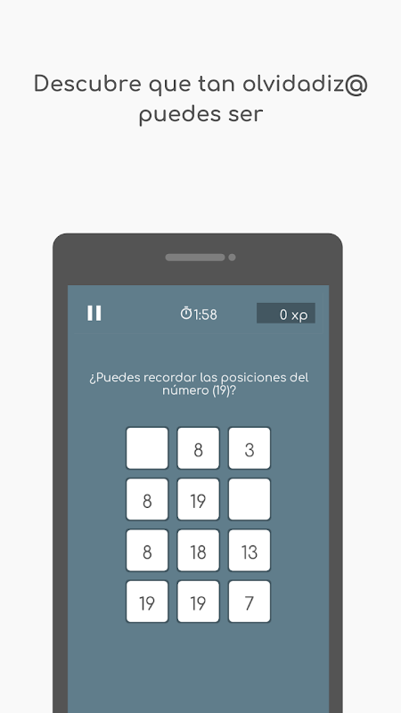 • Retention: in this classification you will have to test your memory trying to remember the positions of the numbers that are shown to you. Games (3-Search and find, 4-discover the numbers).
