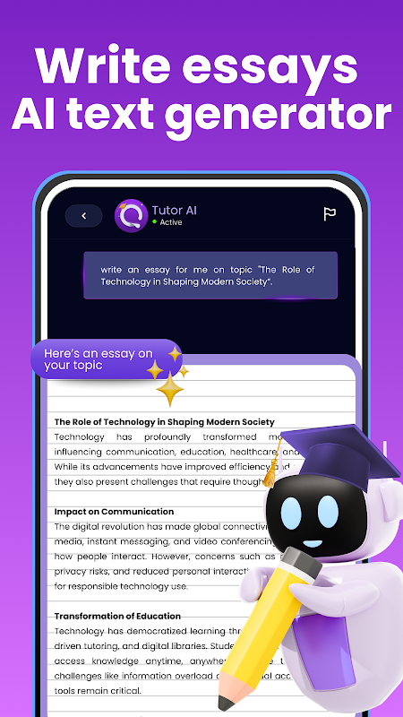 Tutor AI: Math Homework Helper app is to get help with your studies using study helper, writing assistant and problem-solving features. Whether you're working on homework, studying for a test, or trying to understand a topic, AI Tutor - Homework Helper is here to guide you. Ask questions and get answers with AI-powered question solver. The Homework helper - AI Tutor app helps you go through problems step by step across different subjects and levels.