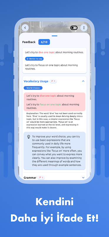 Smart Feedback & Mistake Analysis – Get AI-powered suggestions to improve grammar, vocabulary, and fluency.