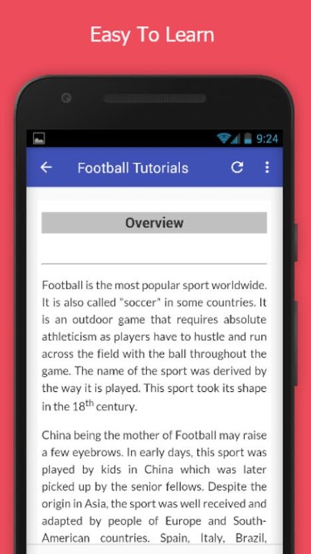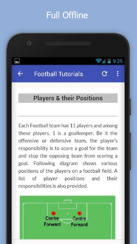 Tutorials for Football Offline is a complete application for those of you who want to learn Football easily and for free. There are dozens and even hundreds of Football tutorials starting to base for beginners to advanced. All these tutorials you can read offline without the need to connect to the internet or mobile data.