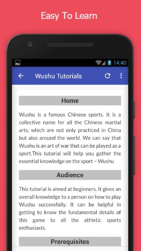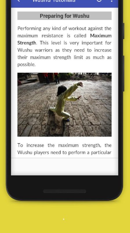 Tutorials for Wushu Offline is a complete application for those of you who want to learn Wushu easily and for free. There are dozens and even hundreds of Wushu tutorials starting to base for beginners to advanced. All these tutorials you can read offline without the need to connect to the internet or mobile data.