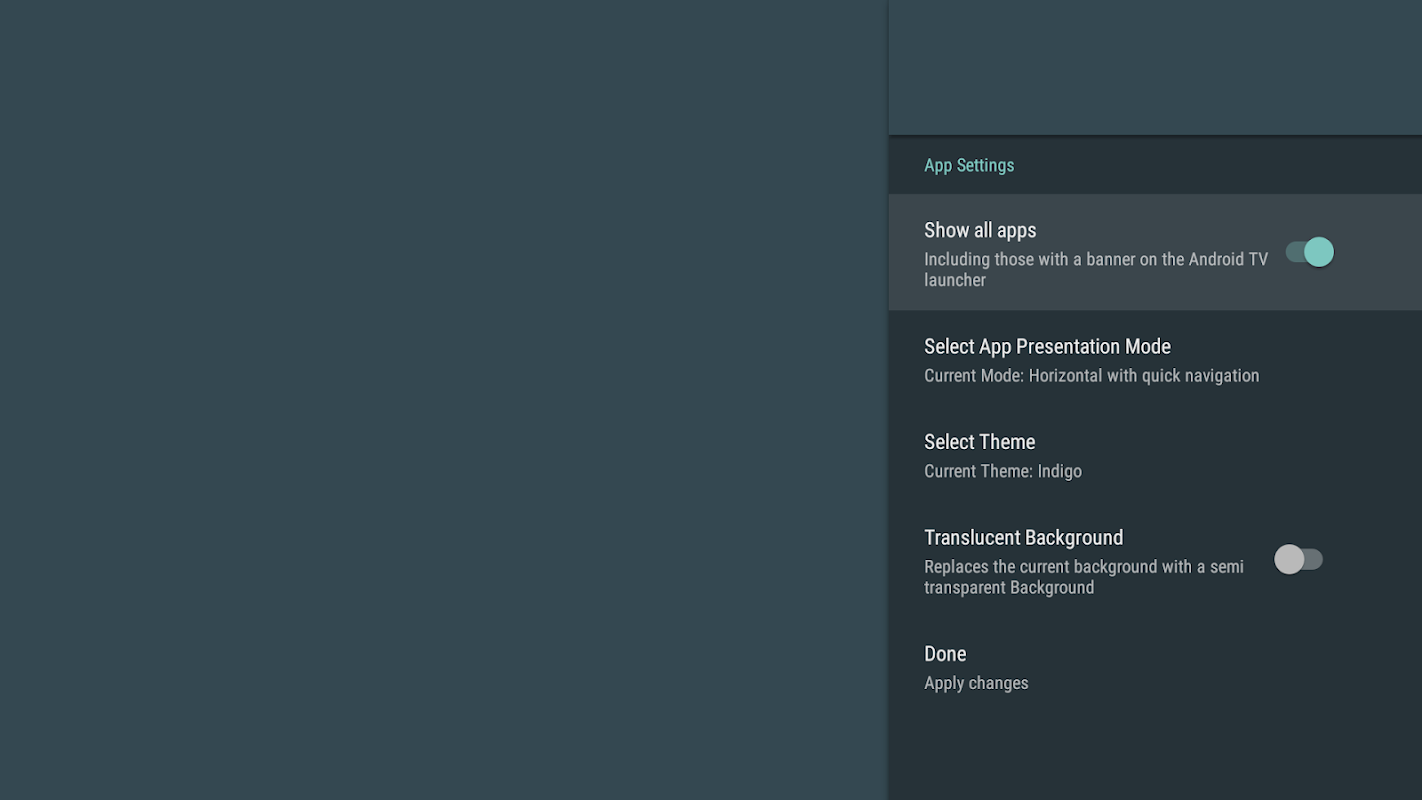 This app's creates a list of all the apps without Android TV home screen shortcut installed on your device so you can launch them quickly without having to browse on your tv settings. You can chose whenever show all the apps or only the non tv apps.