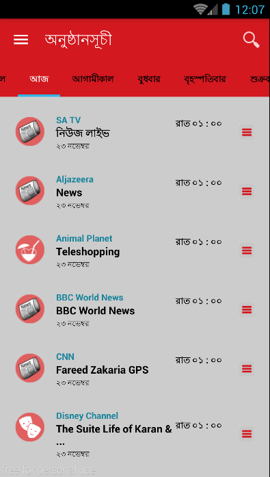 To cater this unique consumer need of the TV lovers the Ultimate and Essential TV Companion is here! Get the latest TV listings for all the major TV channels in Bangladesh. Get Schedule of 25+ most popular TV channels. All the channels (100+) listing coming soon. TV Guide Bangladesh provides detailed information about all the shows, movies, series aired in Bangladesh. Download the TV Guide Bangladesh for free (For a limited time) and get everything you need to make watching TV simple!