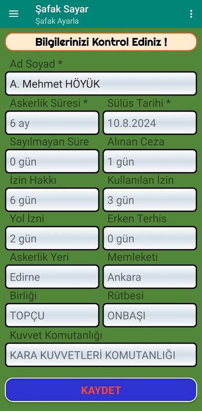 Şafak Sayar 使用起來非常簡單;輸入蘇魯斯日期後,我建議您在「兵役設定」頁面上填寫所需資訊。剩下的就交給App吧。讓他日復一日地算算你的黎明。