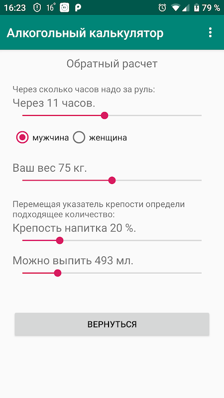 警告!計算由您自己承擔風險和風險。計算結果不能作為法庭證據,作為法律和其他訴訟的依據,可用作證據,以及質疑實驗室測定血液和尿液中乙醇濃度的結果。