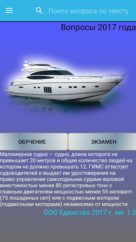 兩種操作模式。訓練模式和考試模式。 “培訓”模式中的問題,部分和塊完全按照俄羅斯緊急情況部GIMS提供的形式進行分組。保留已回答問題的統計數據,程序存儲可以在必要時清除的問題的答案結果。實現了按關鍵字搜索問題的功能。