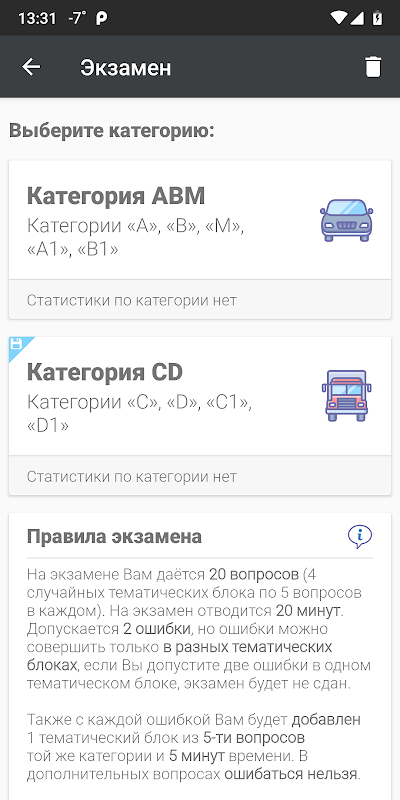 申請的目的是準備通過交警考試的理論部分 ABM 和 CD 類別。該應用程序允許您根據當前40張罰單(官方交警罰單最新變化)列表進行測試。該應用程序還包含道路規則、所有標誌和標記的全文。