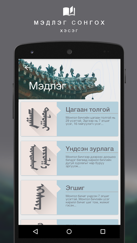 Монгол бичгийн дүрэм судлах болон үсэг тааж монгол бичгийн үсэг цээжлэх апп.