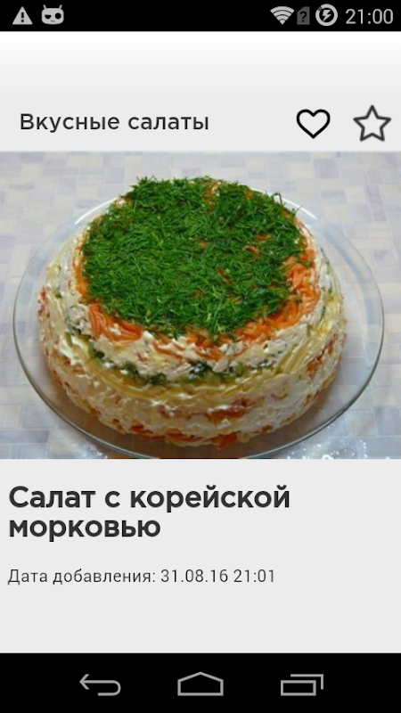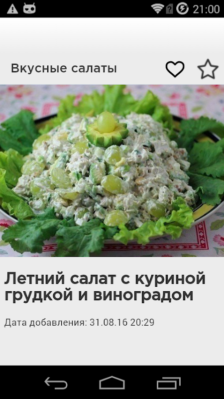 Наше приложение «Вкусные салаты» содержит только проверенные домашние рецепты, которые были приготовлены уже не один раз. У нас вы можете найти блюдо на любой вкус, и следуя нашим рекомендациям вы с успехом порадуете своих друзей и близких. На самом деле, кулинария это не только творчество, где вы можете из обычных ингредиентов создать кулинарный шедевр. Это еще и магия, и во многом, успех приготовления зависит и от вас.