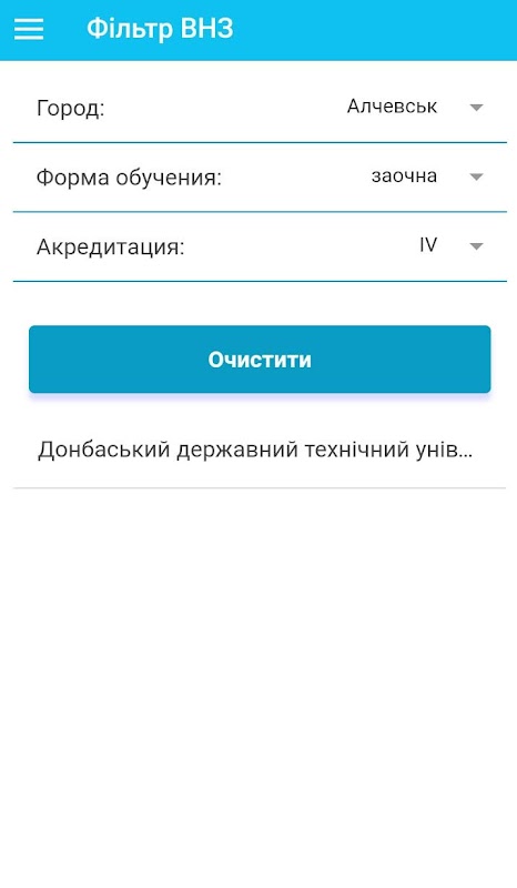 • фільтр за ступенем акредитації ВНЗ та формою навчання.