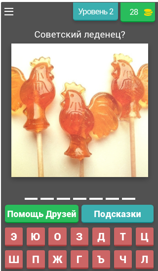 На каждом уровне вы видите картинку с расположенным над ней вопросом по теме. Ваша задача, отгадать и вписать в пустые клеточки ответ на вопрос. При возникновении трудностей, вы всегда сможете воспользоваться подсказкой. За каждый пройденный уровень начисляются монеты. Вот их то и можно расходовать на помощь.
